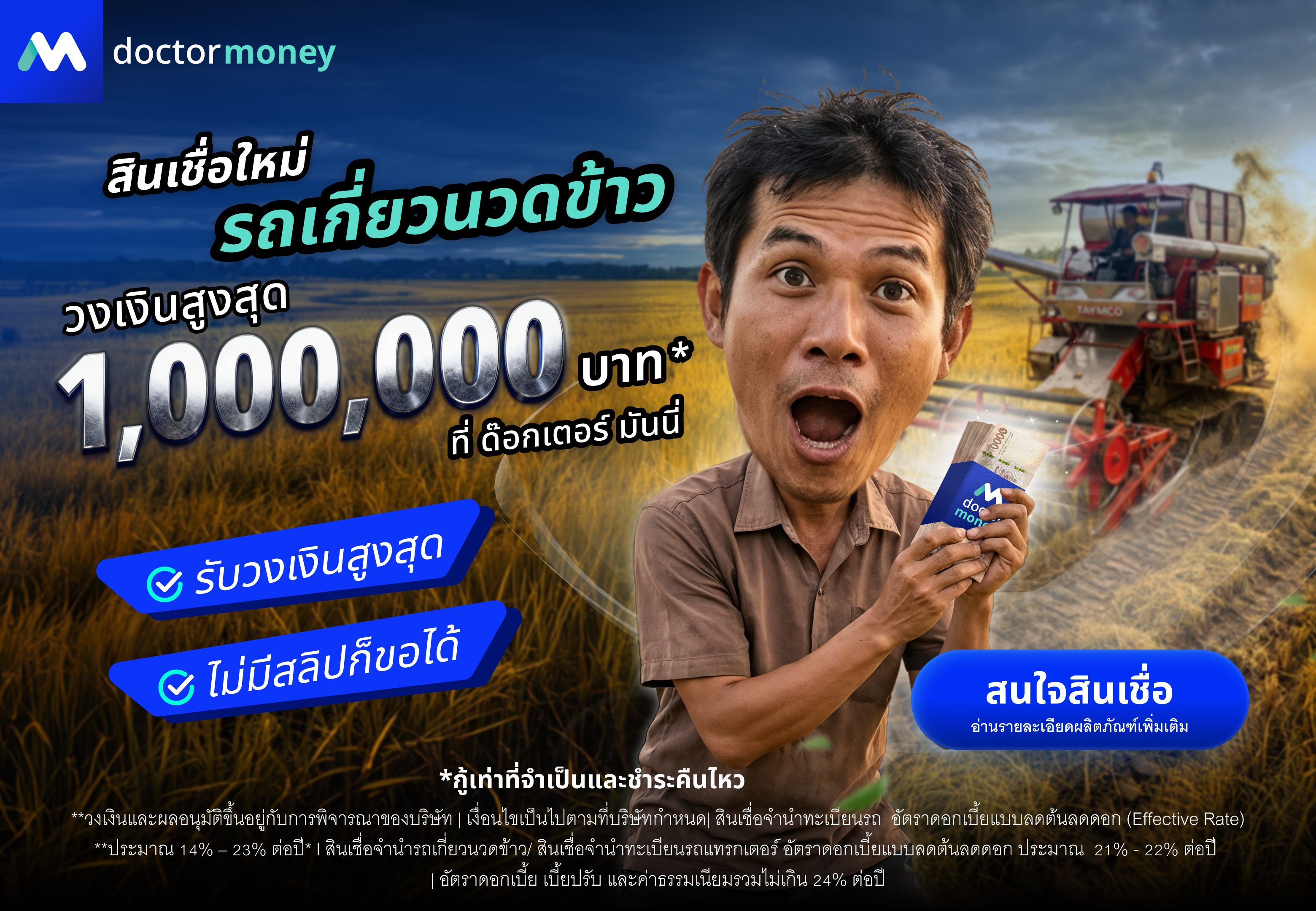 วงเงินสูงสุดสำหรับผู้ที่ต้องการเพิ่มสภาพคล่องทางการเงิน โดยใช้รถเกี่ยวนวดข้าวเป็นหลักประกัน พร้อมใช้งานรถได้ตามปกติระหว่างสัญญา